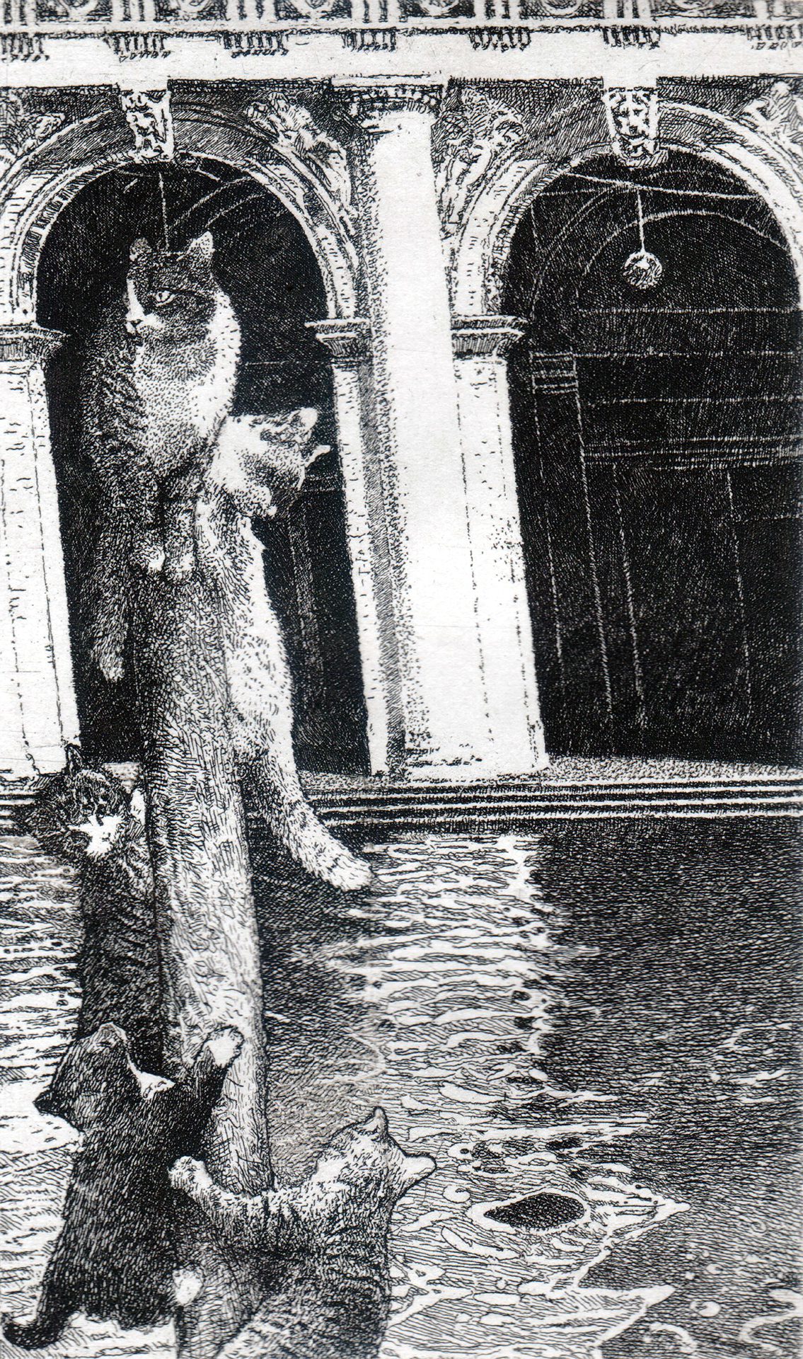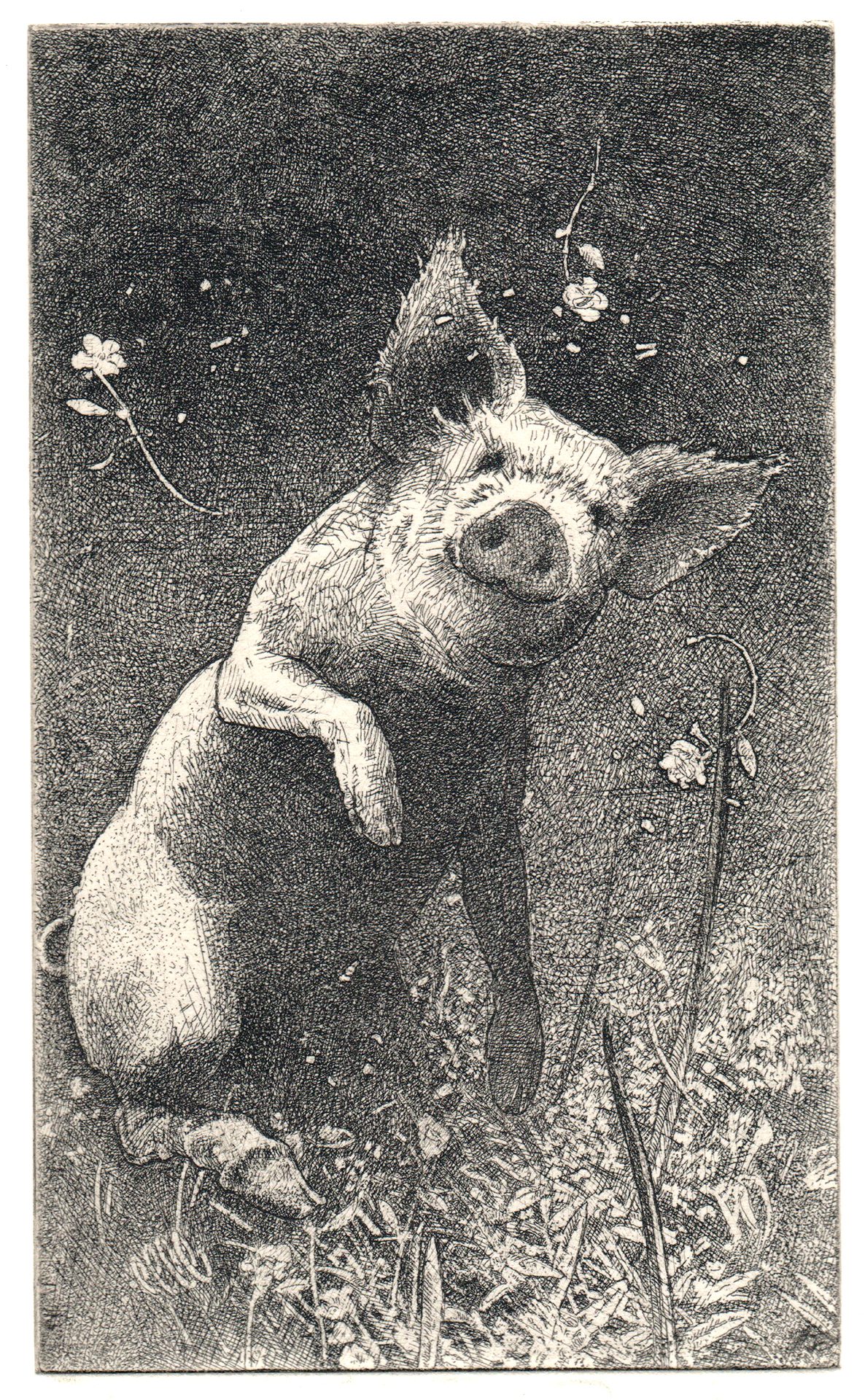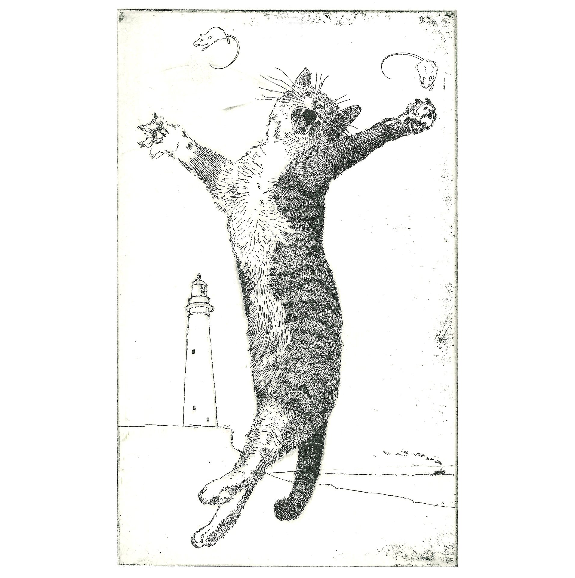 The etching process involves drawing on copper plates, immersing them in acid and transferring images onto paper. The plate can produce copies of the original, and Alan issues these as numbered editions. “Copper plates are covered with a dark, acid-resistant, waxy ground,” he said. “Marks are made with sharp tools that expose the copper color. Evaluating the drawing takes skill as lines which will eventually print as black on a white ground appear as light lines on a dark ground. And of course, they are right-reading rather than left-reading.”