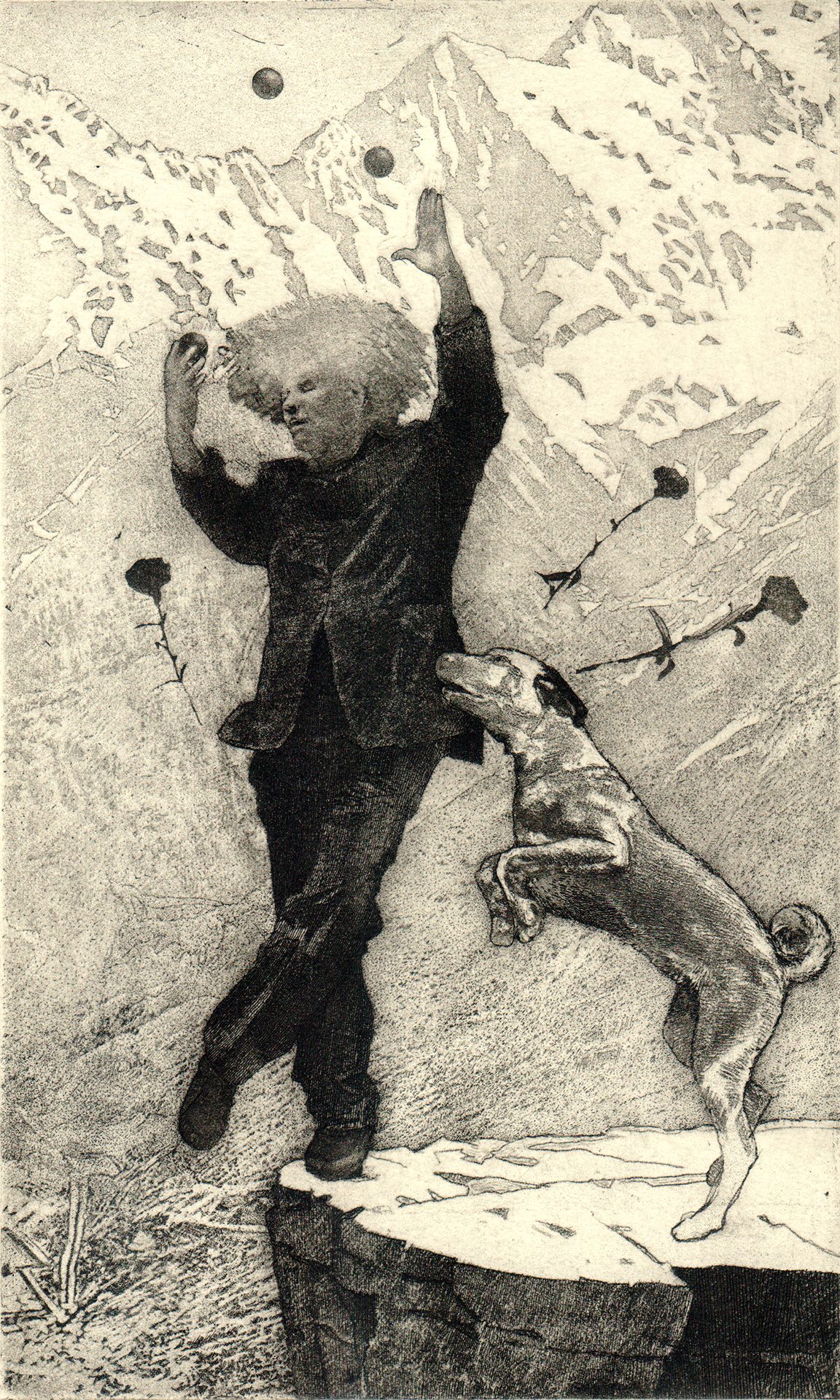 The process involves multiple steps. If the image is too light, the plate can be re-ground and new marks added. If it is too dark, marks can be scraped, burnished or sanded off. Alan frequently adds very fine details and often works under a microscope.