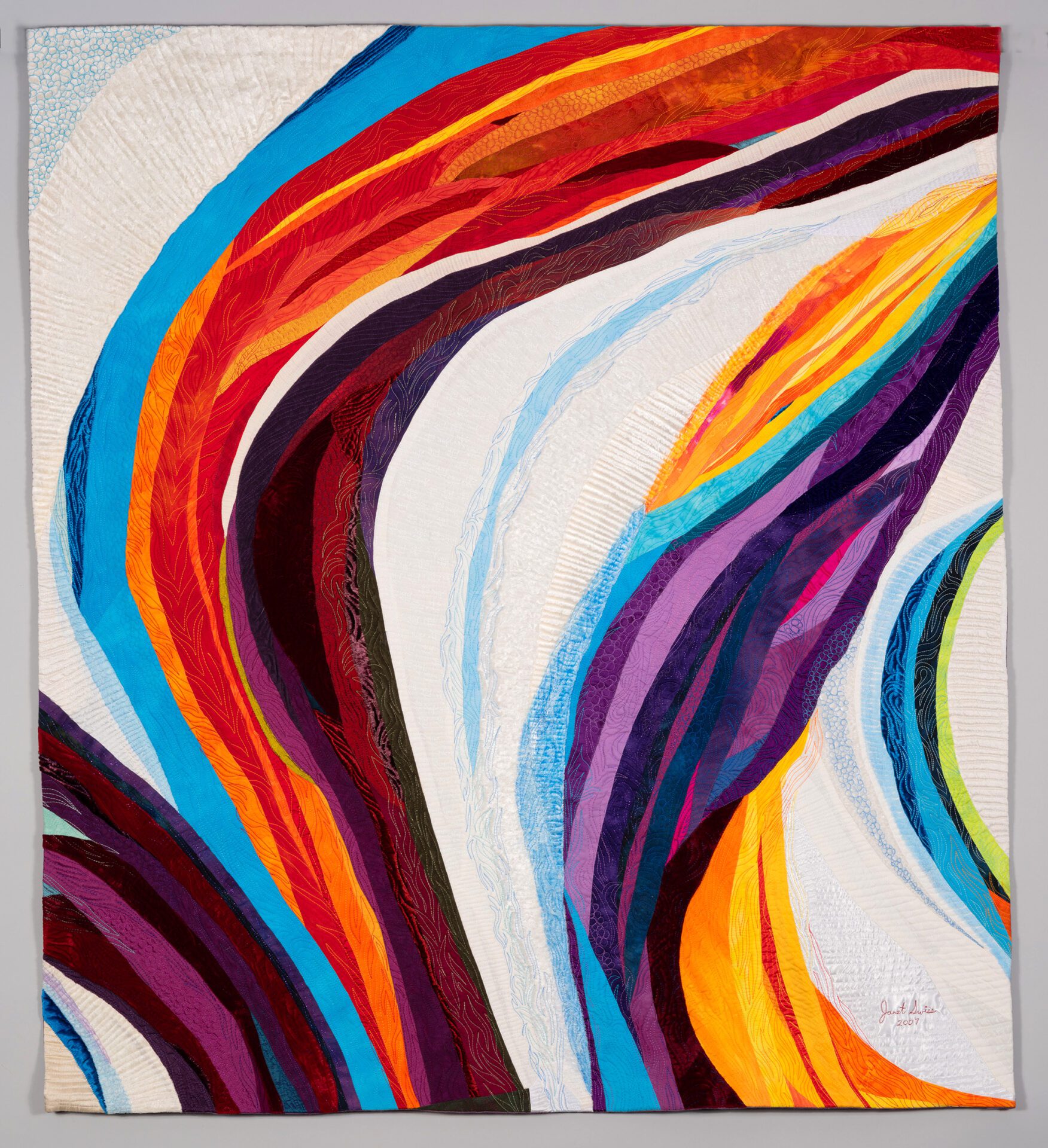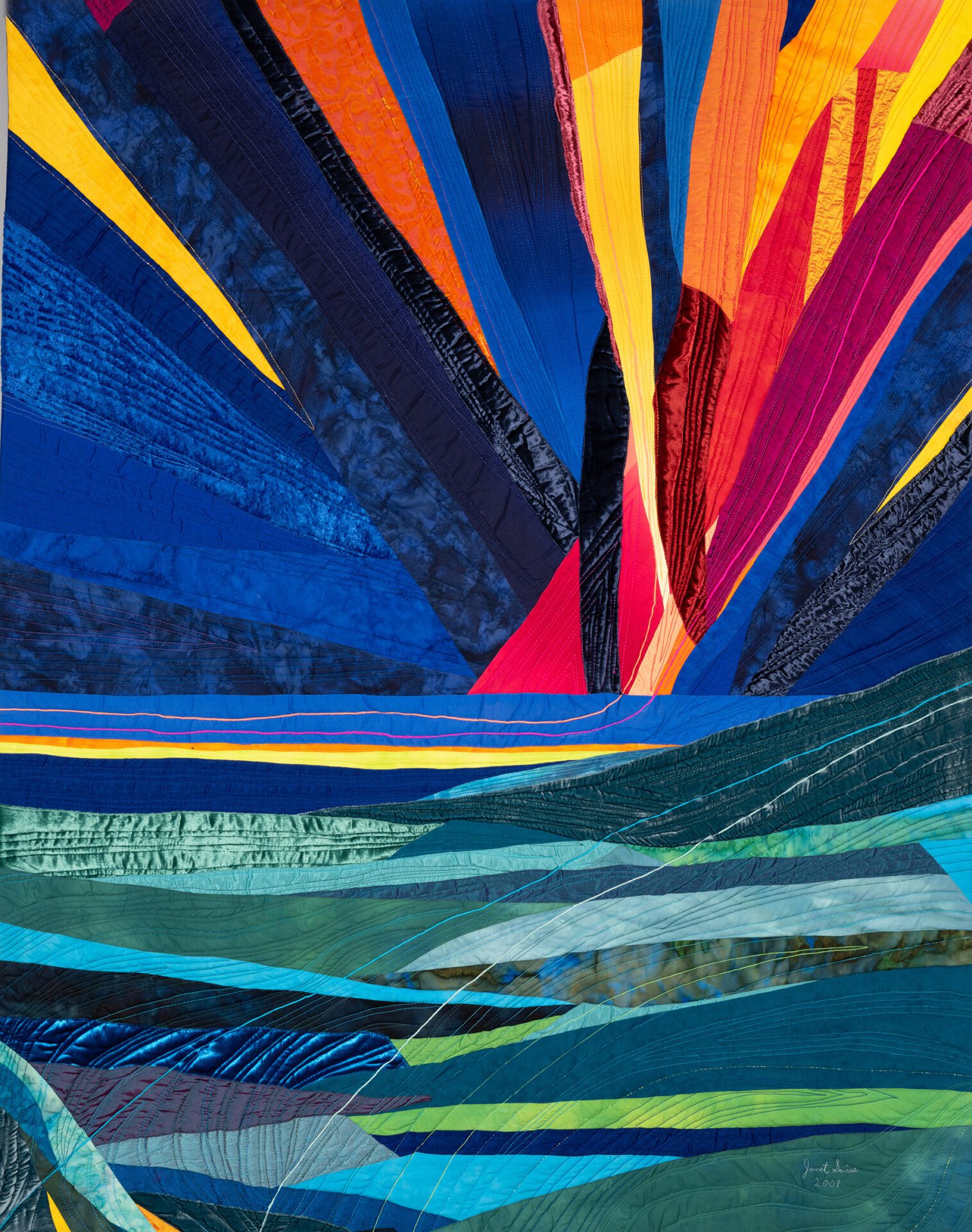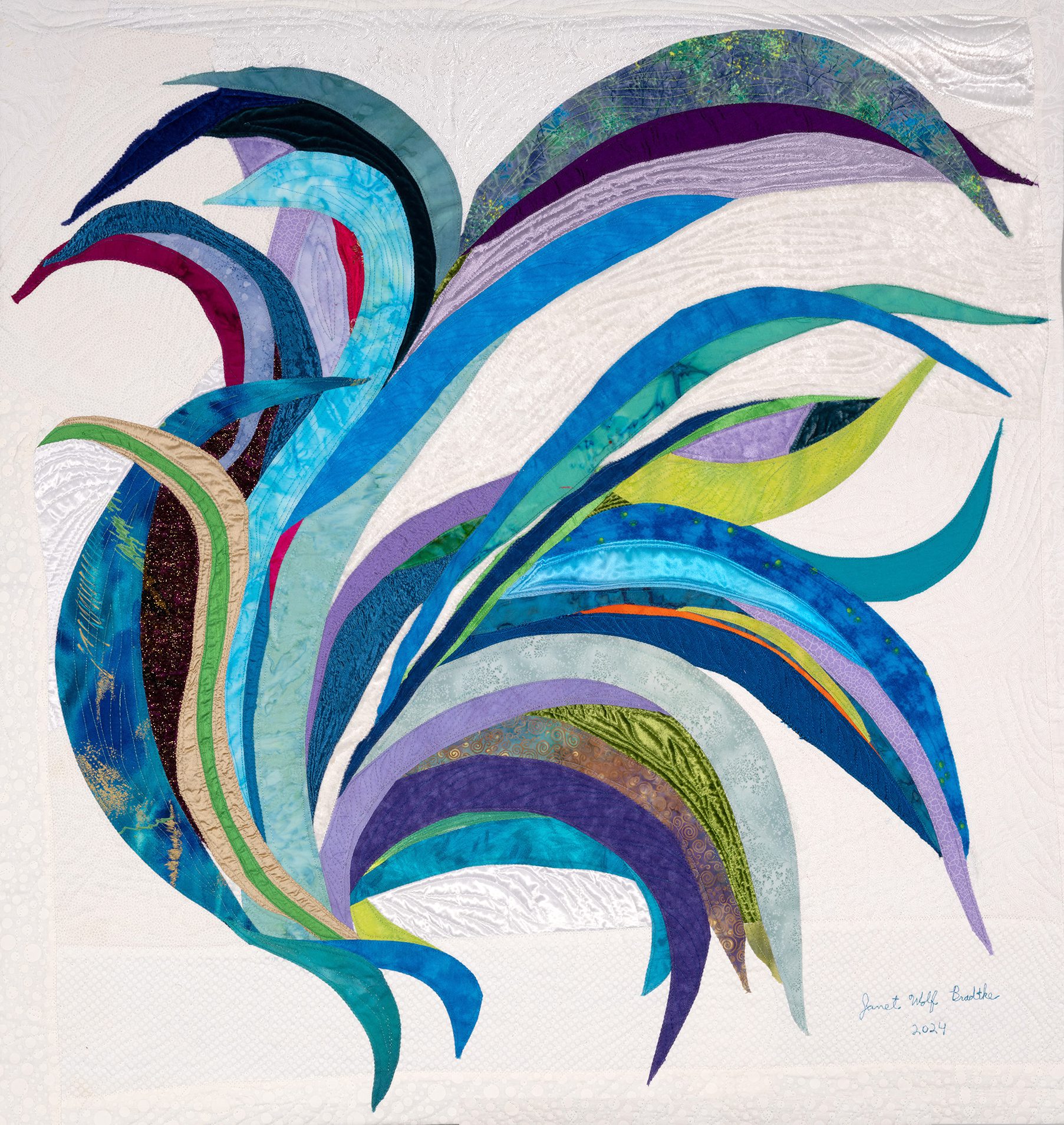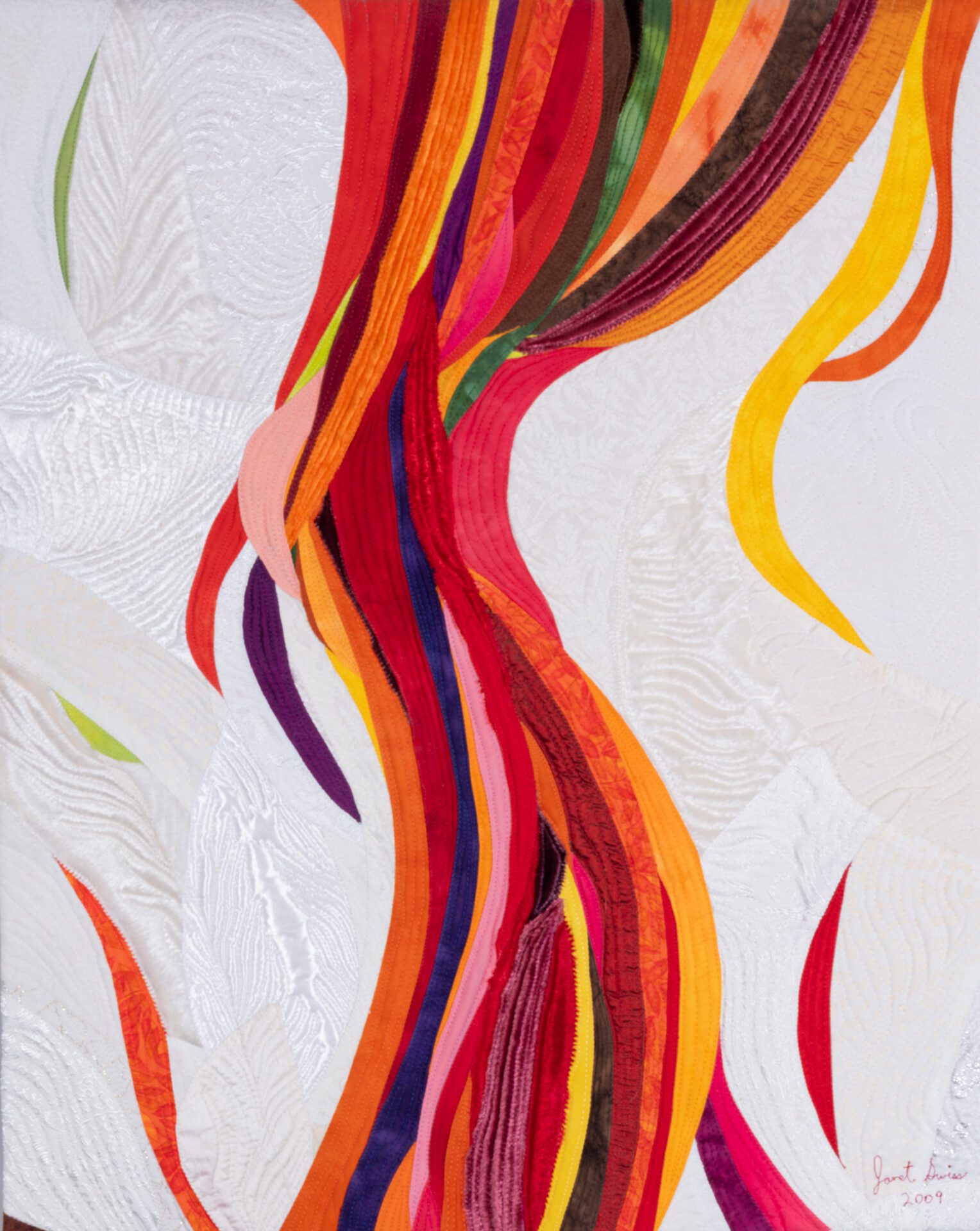 Janet creates art through the age-old process of quilting, piecing bits of fabric together and finishing the layers by stitching them together creating texture in addition to design. Janet says “My technique is essentially quilting, done in my own unique way. The finished work has a front, middle batting layer and a back that are sewn together in the manner of a quilt. The design aesthetic of my art quilts is all about color, movement and light. I love the challenge of conveying my ideas through fabric and thread.”