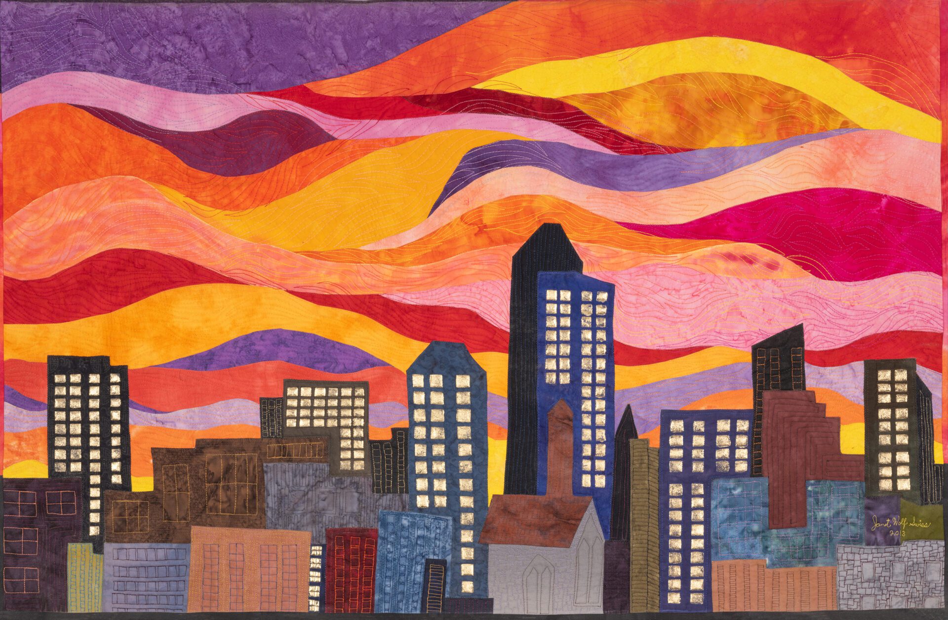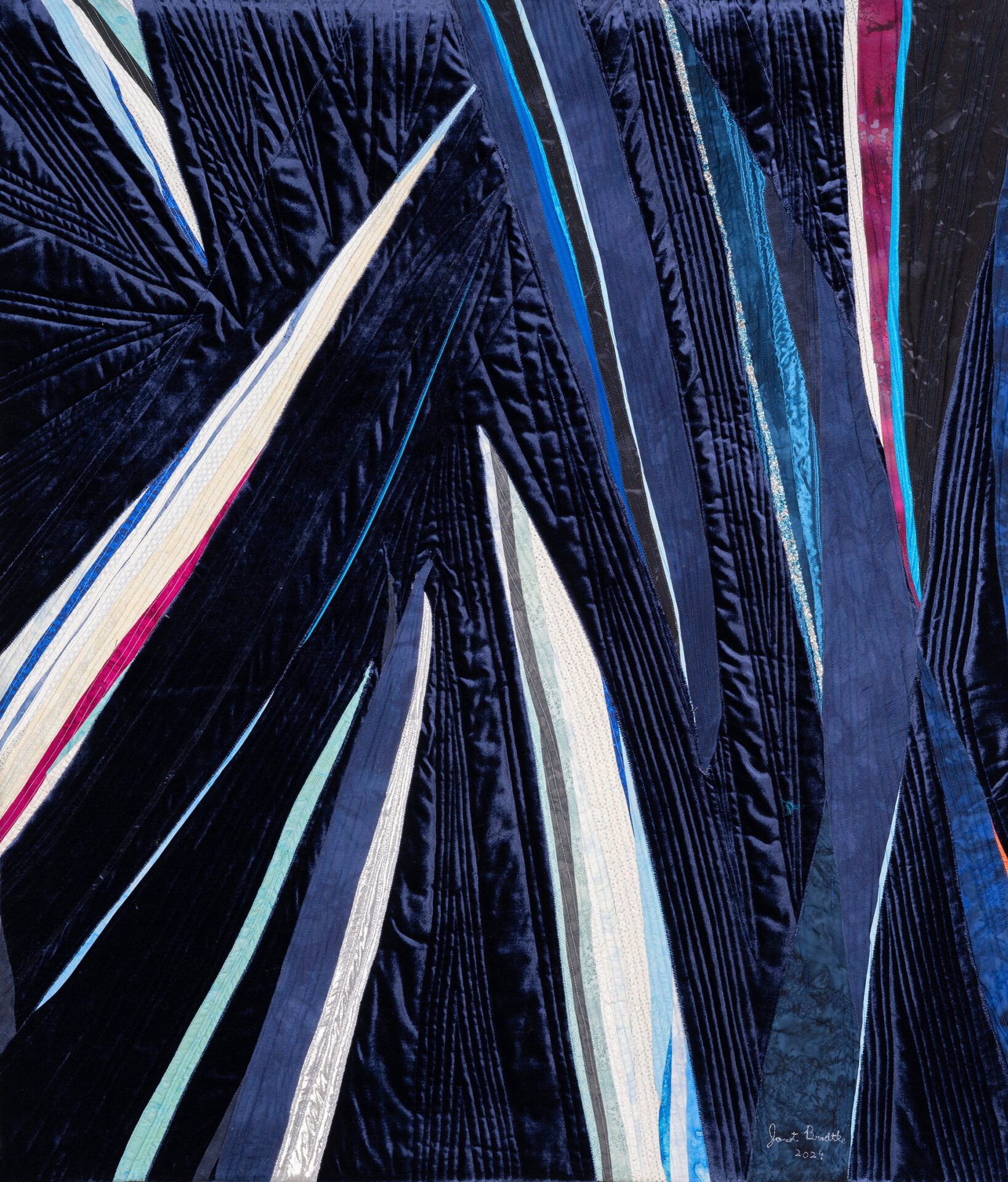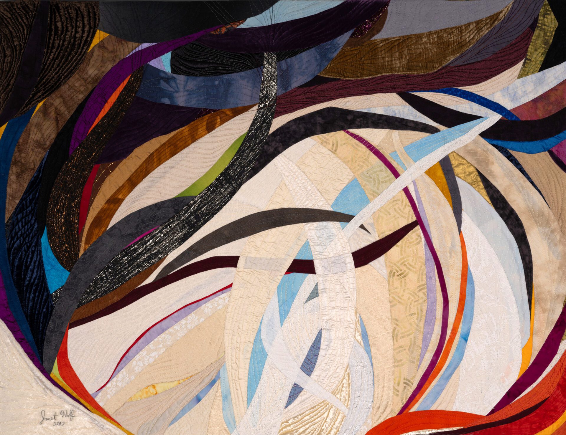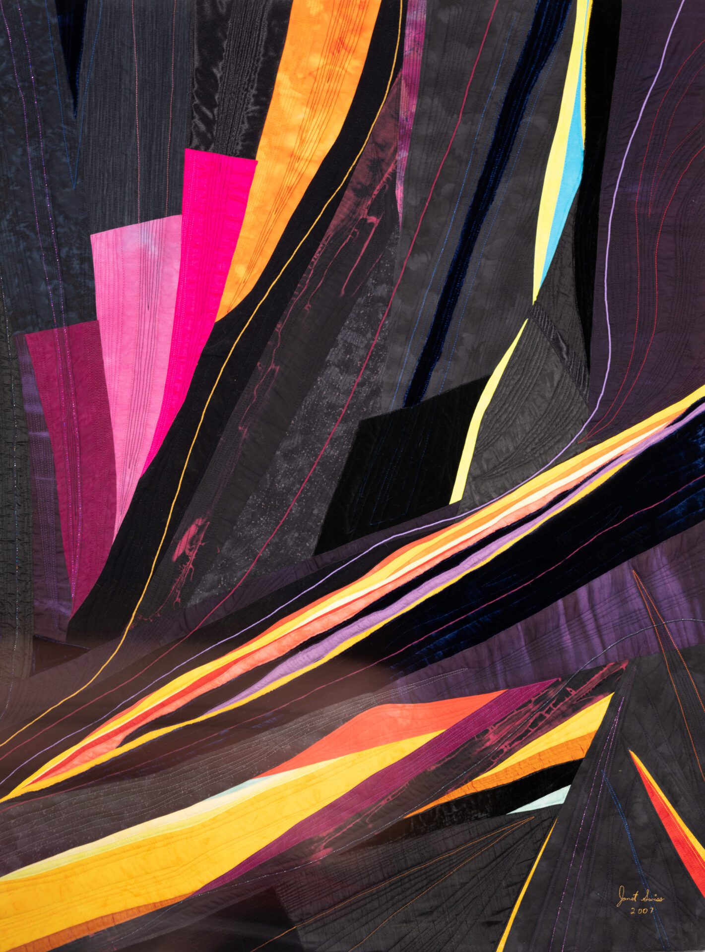 Janet creates art through the age-old process of quilting, piecing bits of fabric together and finishing the layers by stitching them together creating texture in addition to design. Janet says “My technique is essentially quilting, done in my own unique way. The finished work has a front, middle batting layer and a back that are sewn together in the manner of a quilt. The design aesthetic of my art quilts is all about color, movement and light. I love the challenge of conveying my ideas through fabric and thread.”